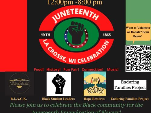 Join us each year as we celebrate Juneteenth in La Crosse! More details on the event can be found on the La Crosse Juneteenth Website.